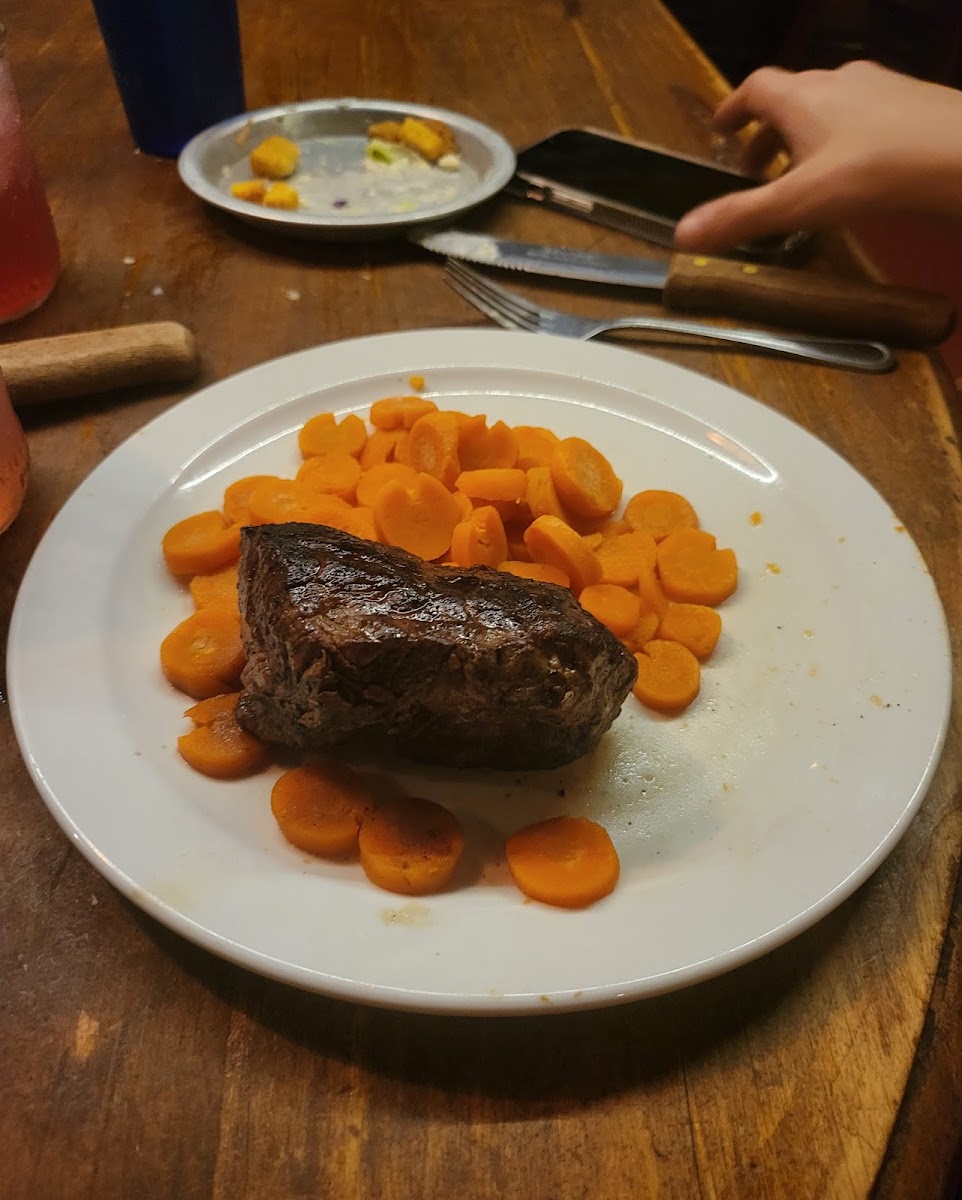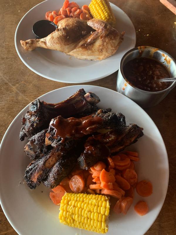 In all the food was good, the atmosphere was nice and it was compatible with my dads taste in atmosphere. He put his music up and it fits. The pork rib was really falling apart off the bones, and so was the beef ribs. There was a lot of carrots I had to finish up, but there way of calling the fry bread biscuits was cute. The root beer was at a 1 out of 10 for me, 7.